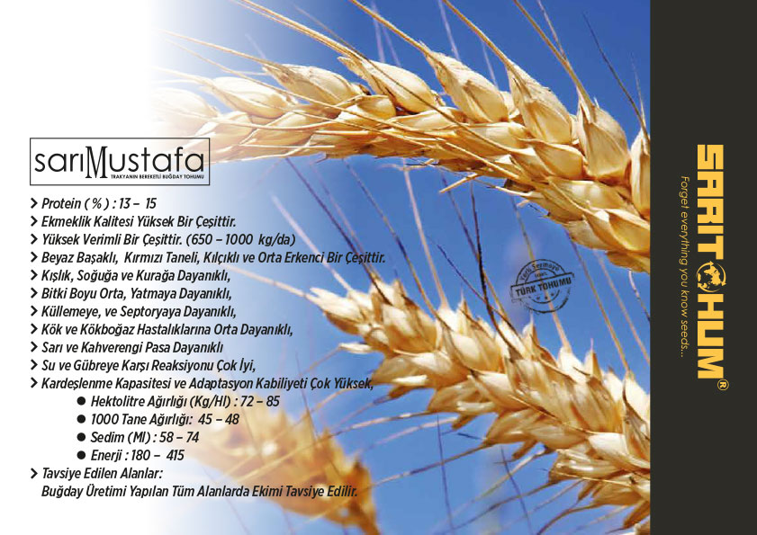 Sarı Mustafa, yüksek verimli, hastalıklara dayanıklı çeşidimiz Sarı Mustafa, tarlada güçlü duruşu ve başakta dolgun yapısıyla fark yaratır. Çiftçinin emeğini altına çeviren Sarı Mustafa, toprağınıza bereket katar.