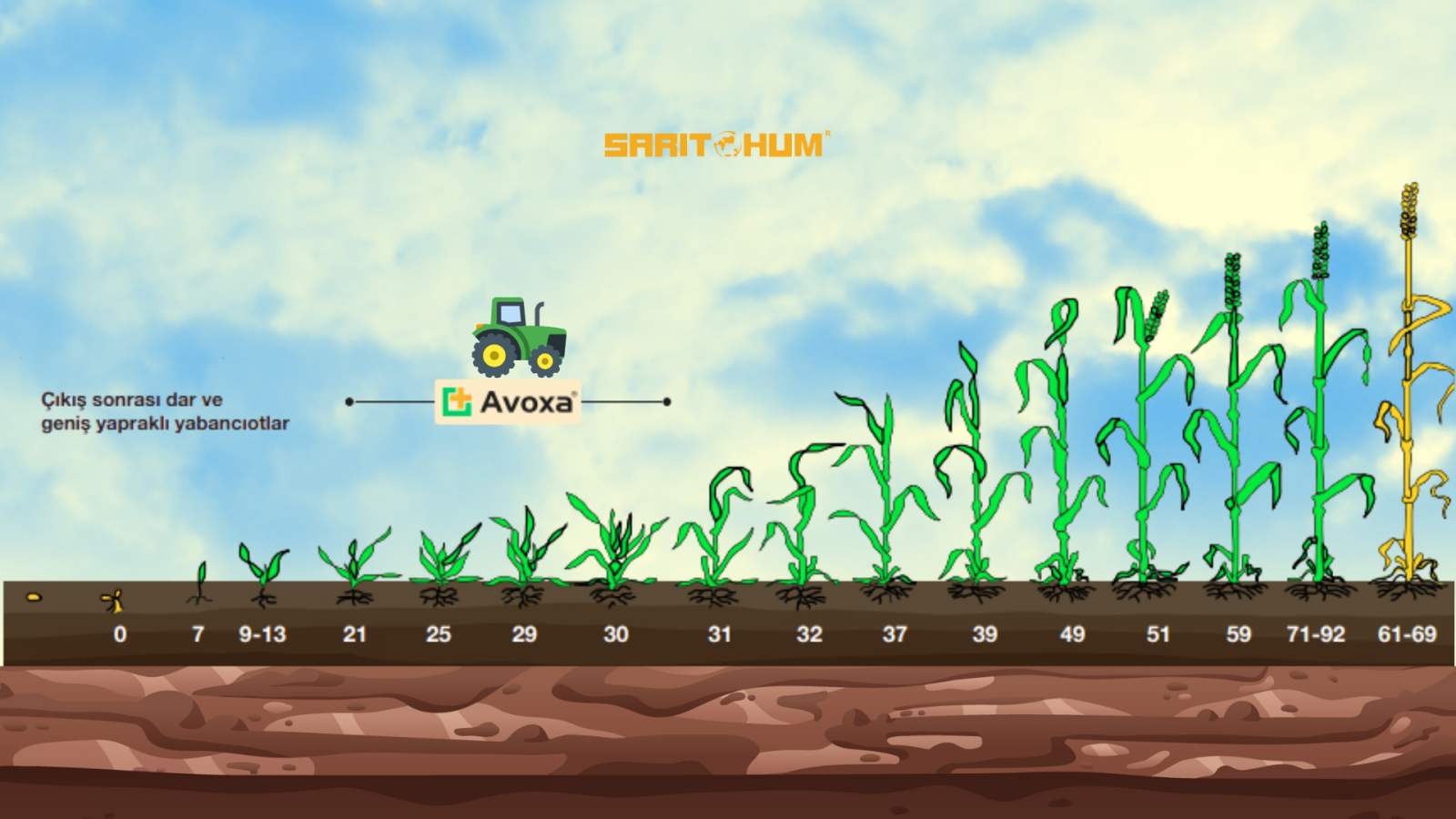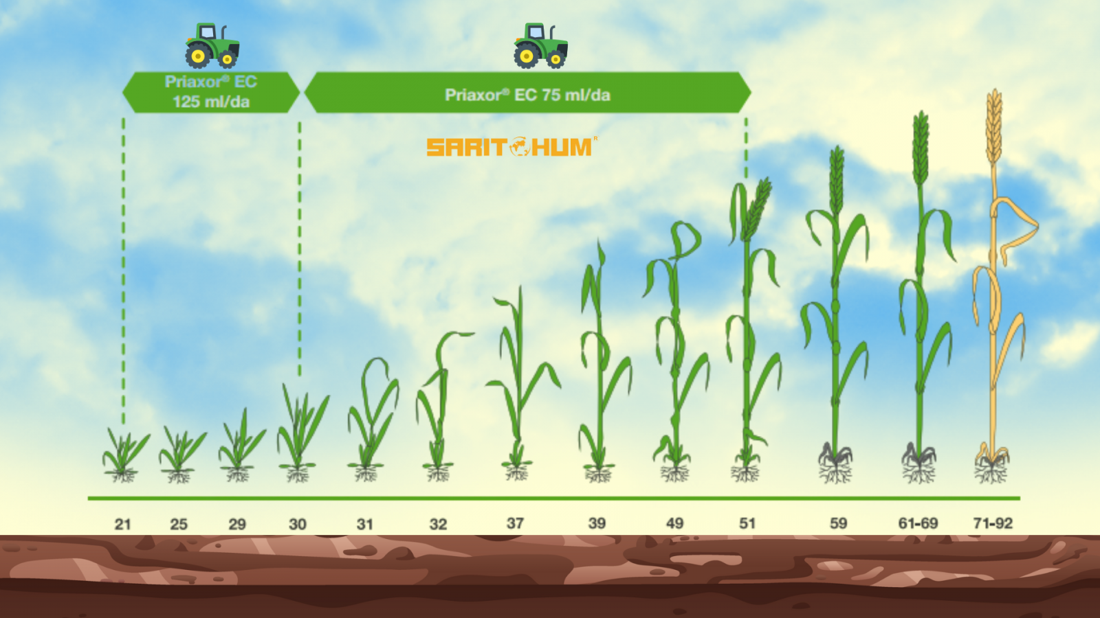 UYGULAMA ZAMANI: Sarı Mustafa'nın yüksek çıkış temposunu destekler, özellikle kardeşlenme sonu ve sapa kalkma dönemlerinde maksimum etki sağlar. Tavsiye edilen kullanım dozu dekara 200 ml’dir.